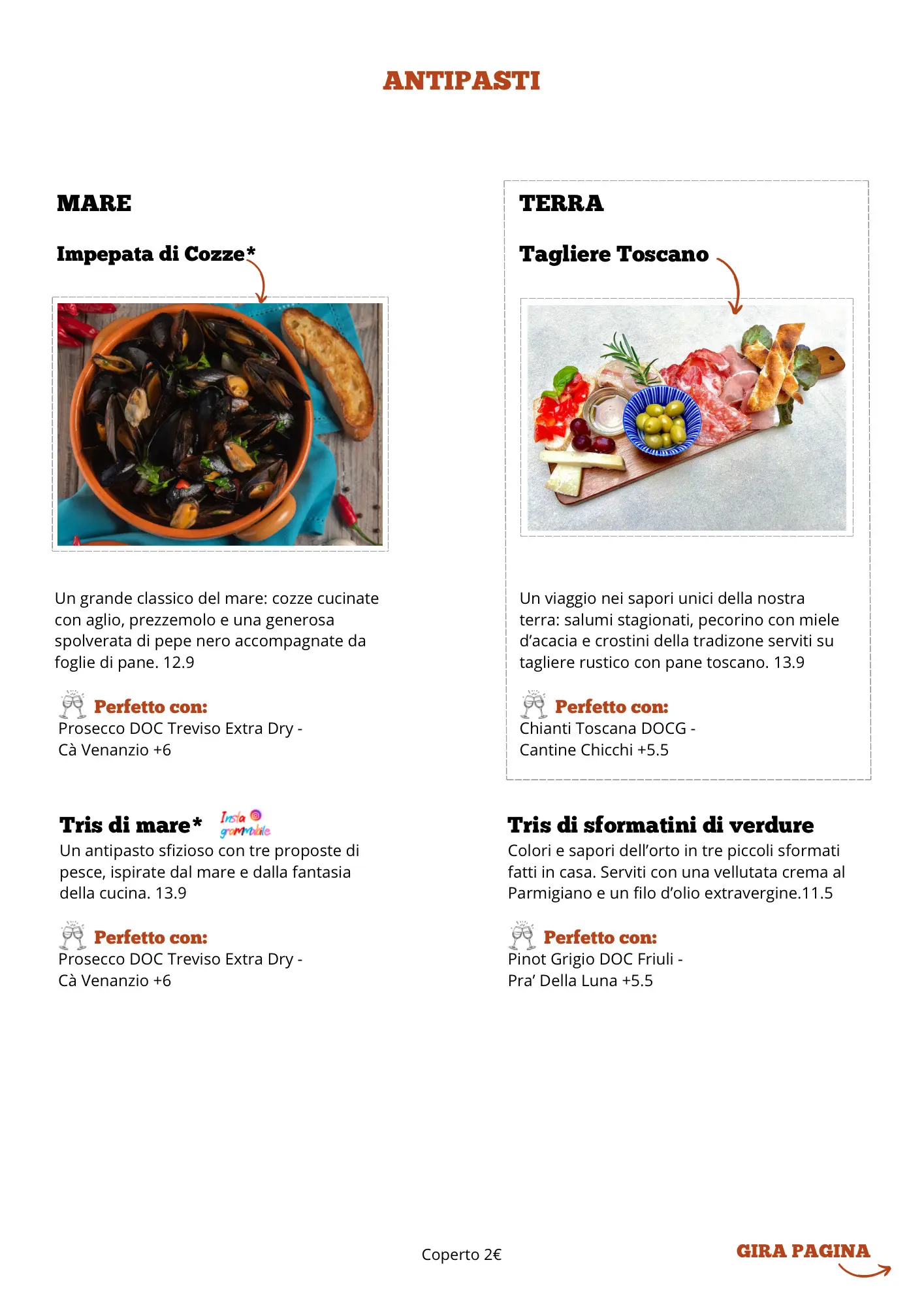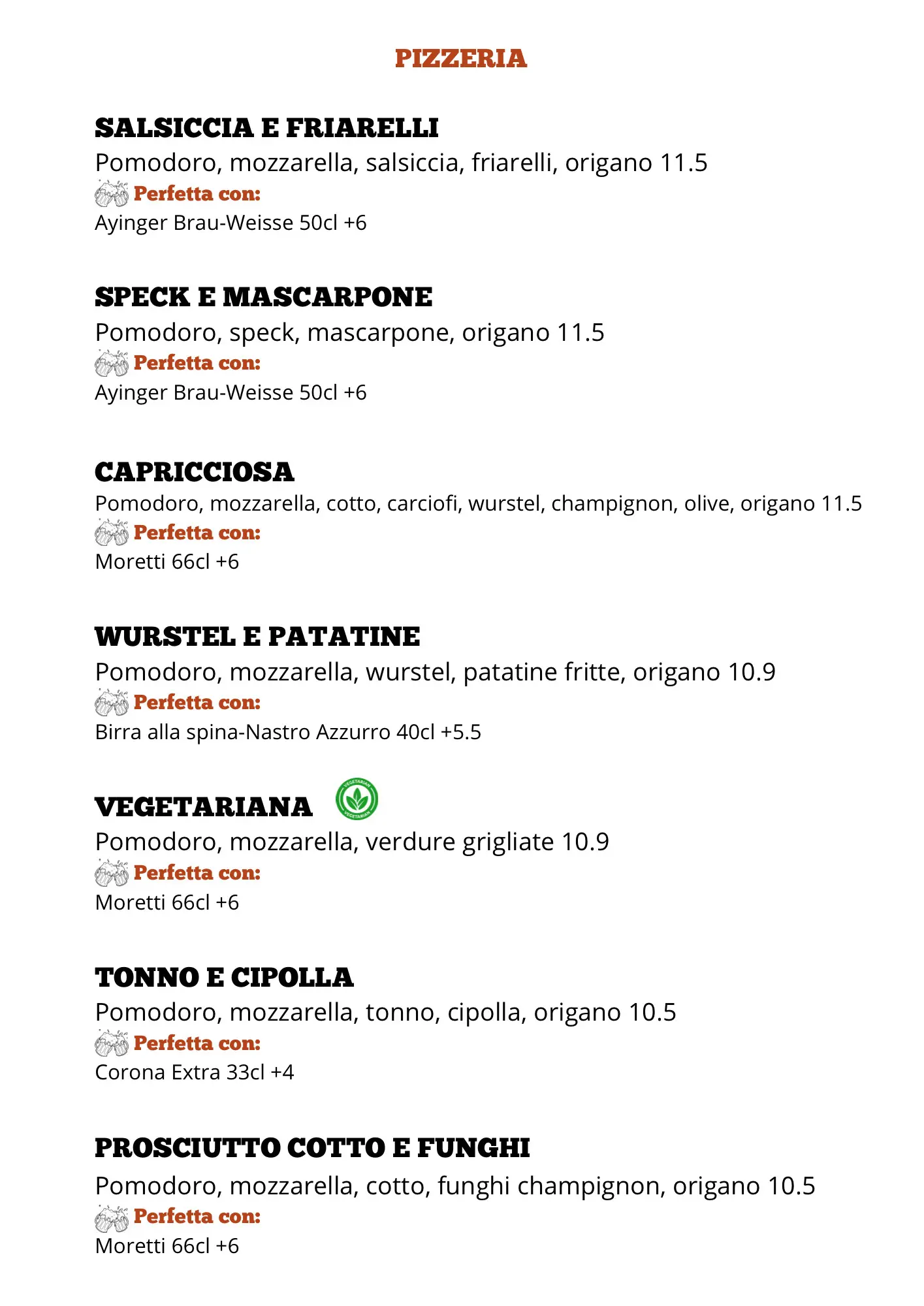 In the evening the pizzeria comes to life with a wide selection of perfectly cooked pizzas, made with light dough and selected ingredients to offer you taste and digestibility.