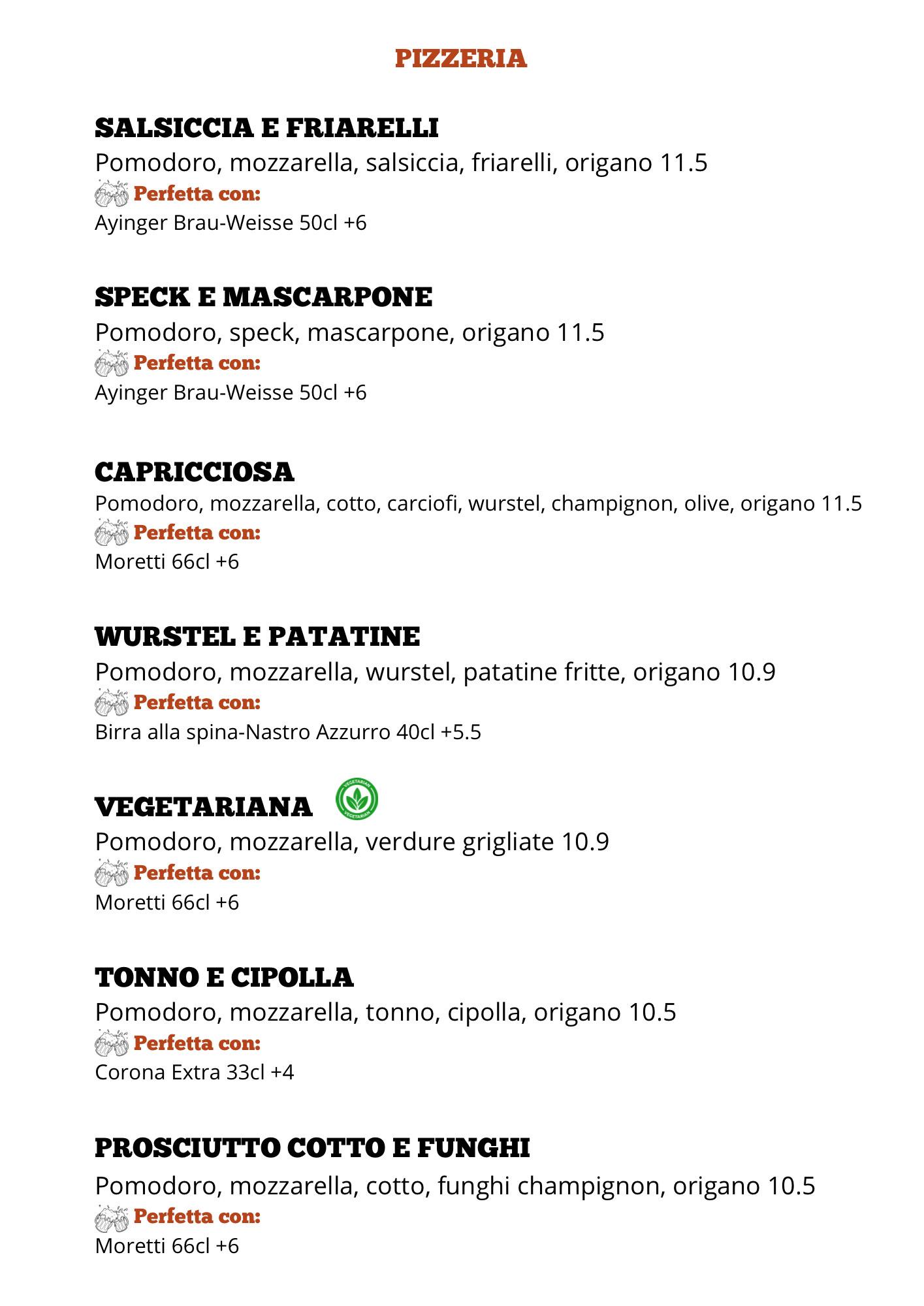 Alla sera la pizzeria prende vita con un’ampia scelta di pizze cotte a puntino, realizzate con impasti leggeri e ingredienti selezionati per offrirti gusto e digeribilità.